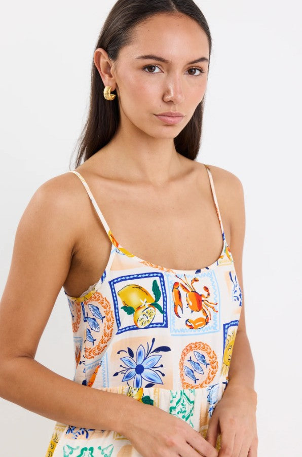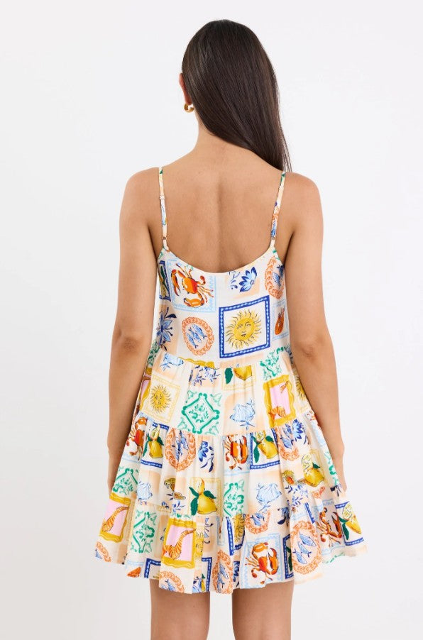 A vibrant and playful piece, designed to bring a touch of sunshine to your wardrobe. Featuring a colorful holiday-inspired print, this strappy mini dress boasts a tiered silhouette that flows beautifully with every step. The lightweight fabric offers a soft and breathable fit, perfect for warm weather. The strappy design ensures a relaxed, breezy feel, while the tiered style adds a flirty, feminine touch.