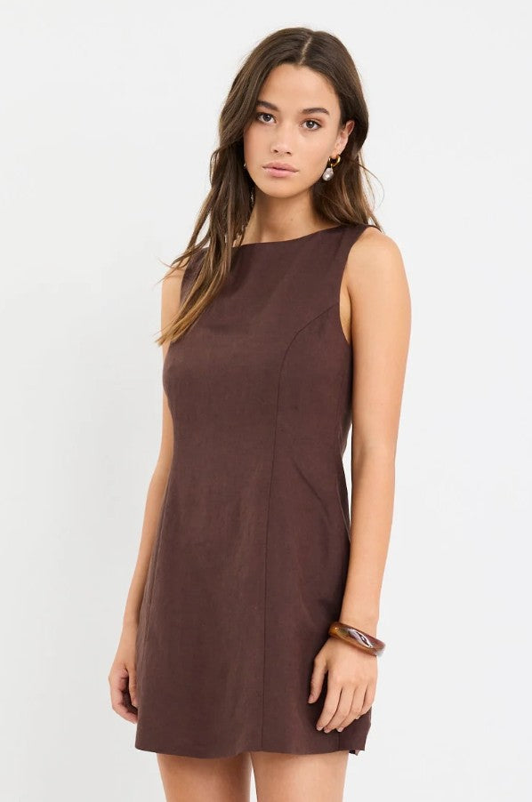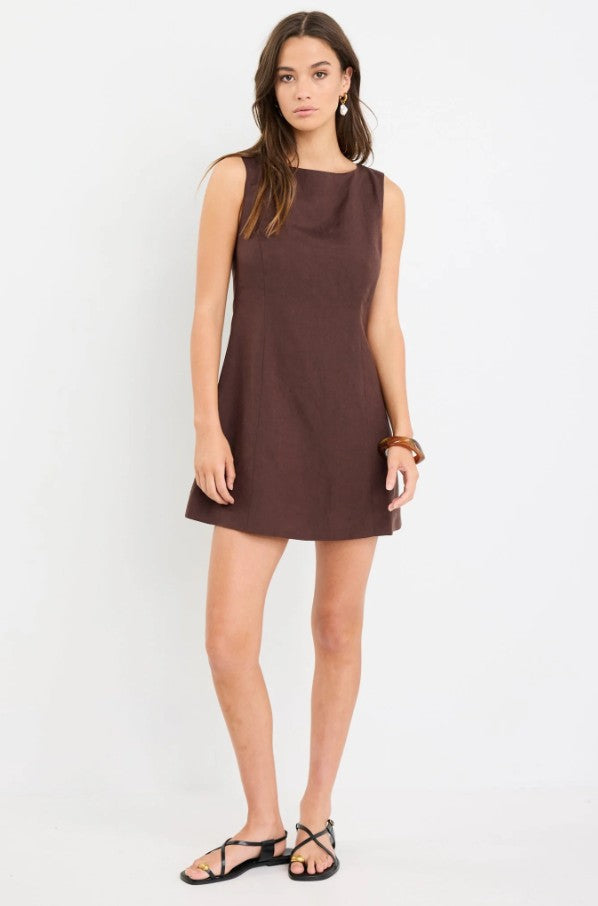 The Venice Chocolate Boat Neck Fitted Mini Dress combines timeless elegance with modern simplicity. Crafted from a linen-viscose blend, this sleeveless mini dress features a refined boat neckline and a structured, fitted silhouette that enhances natural shape. Fully lined for a smooth finish, it’s a versatile piece that transitions effortlessly from casual days to elevated evenings.