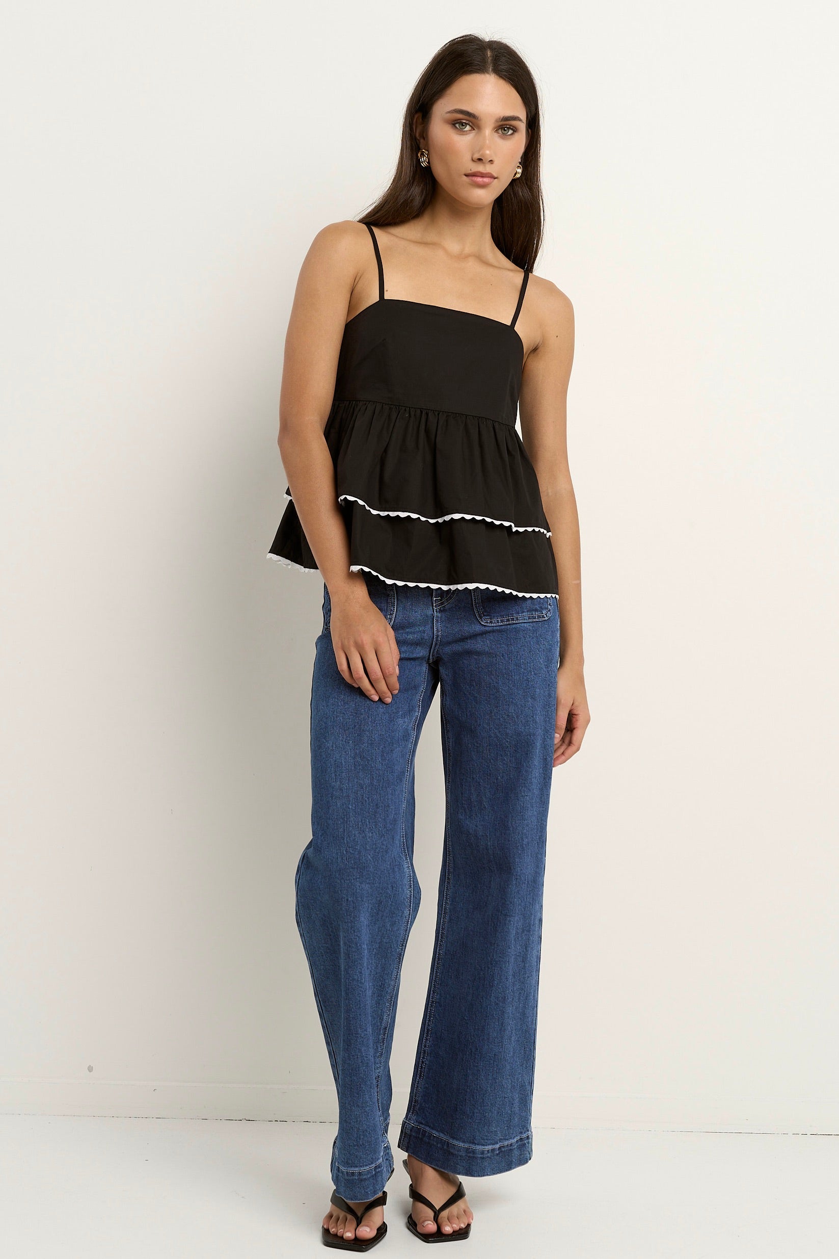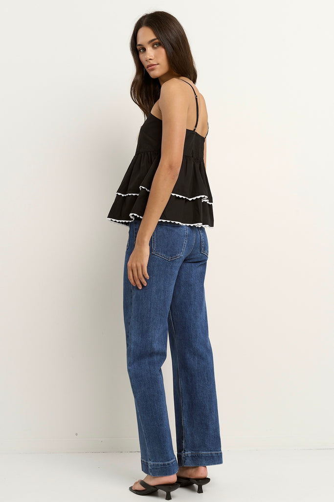 Bold and playful, the Admire black and white trim top brings a modern twist to feminine dressing. Crafted from breathable cotton, this tiered design features delicate white wave trims that pop against the crisp black fabric. The relaxed fit and slim straps offer a flattering shape that feels light and easy for every day.