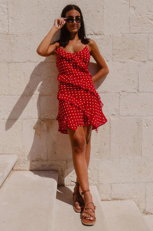 Turn heads with the playful charm of the Passion cherry ditsy polka dot mini dress from Georgia Mae. Crafted in a vibrant cherry-red hue scattered with delicate white dots, this flirty piece is all about fun, confidence, and carefree style. The cascading frill detailing adds movement and texture, while the bias-cut shape flatters your natural curves with ease.