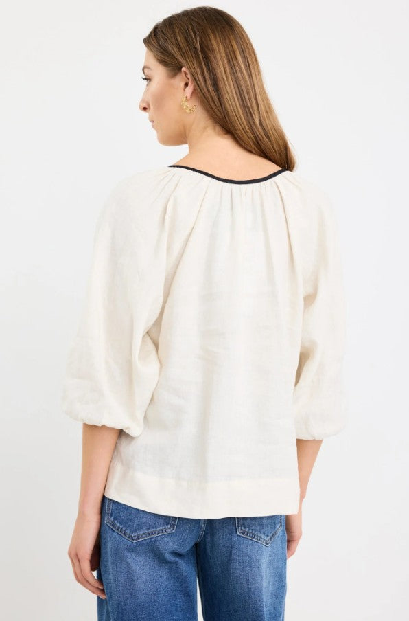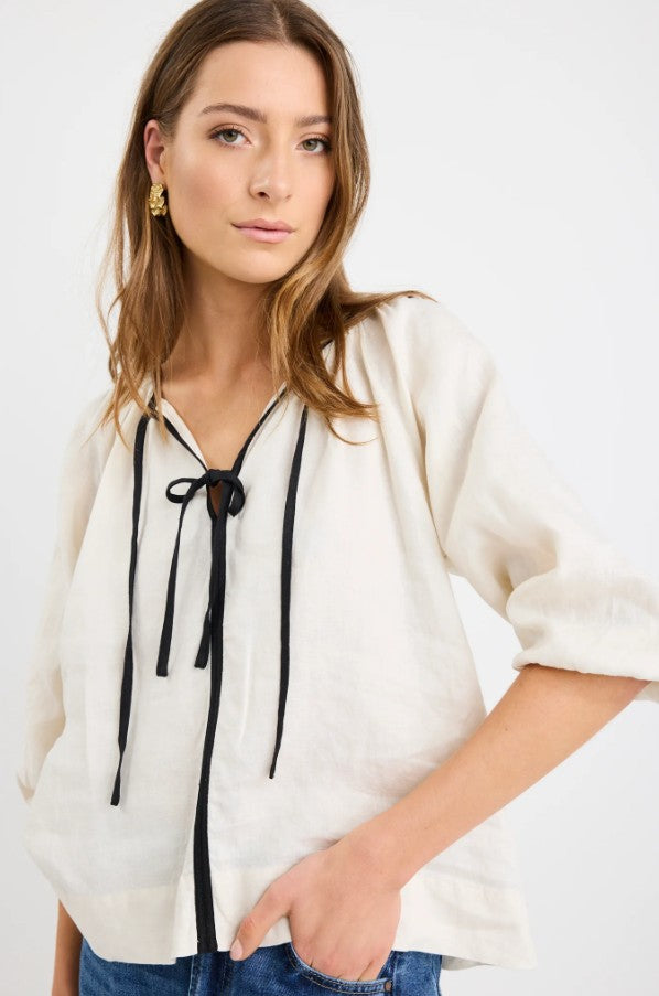 The Subliminal Cream Black Trim Linen Relaxed LS Top blends relaxed ease with refined detailing. Crafted from 100% linen, this lightweight top features contrast black ties and trim that add a touch of definition to its airy silhouette. Designed with puffed long sleeves and an oversized fit, it delivers effortless style perfect for layering or wearing solo.