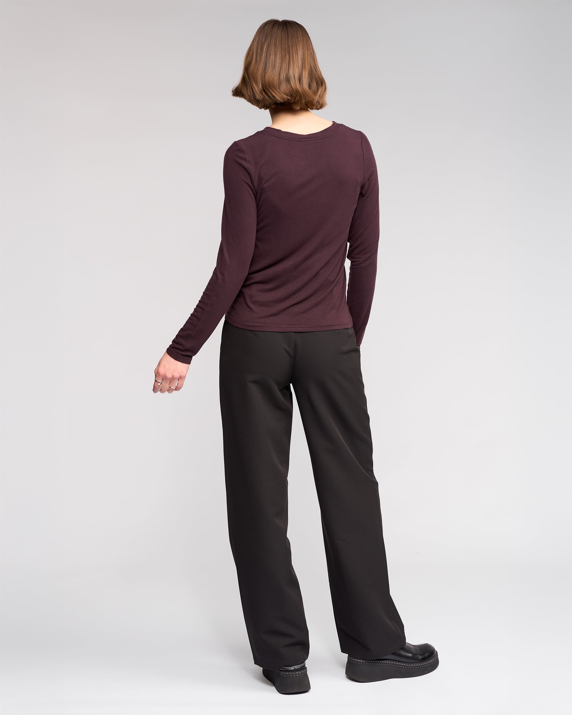 Everyday long sleeve top in Raisin, a rich, deep purplish hue, crafted from a soft Tencel, wool, and elastane blend. Featuring a round neckline and a relaxed, comfortable fit, this versatile top is perfect for layering or wearing on its own.