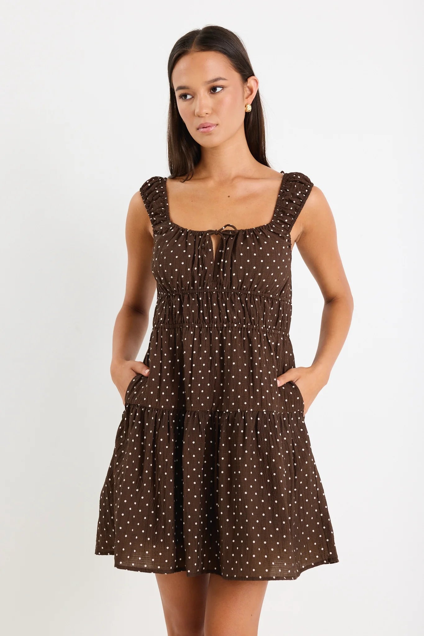 Add a little fun to your wardrobe with the Tricky Chocolate Mini Polka Dot Dress. This dress features a playful polka dot print on a rich chocolate brown base, making it perfect for both casual and dressed-up days. The tiered skirt and ruffled straps give it a feminine, flirty vibe, while the tie-front detail adds a sweet touch. Fully lined for extra comfort and coverage, it’s your go-to for effortless style across the summer season.