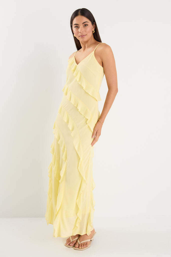 The Galore Butter Maxi Dress from Georgia Mae is your flirty-meets-feminine moment, wrapped in breezy, ruffled fabric. With delicate frill details cascading down a bias silhouette and a classic butter yellow colour, it’s a piece made to move with you. This one ticks all the boxes for effortless elegance and easy glamour.